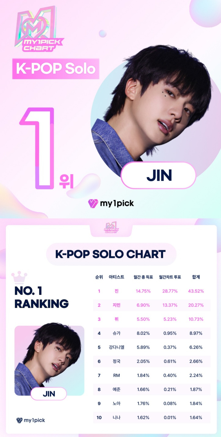 방탄소년단(BTS) 진이 마이원픽(MY1PICK)에서 주간랭킹과 월간차트에서 우승을 차지하며 인기를 빛냈다.