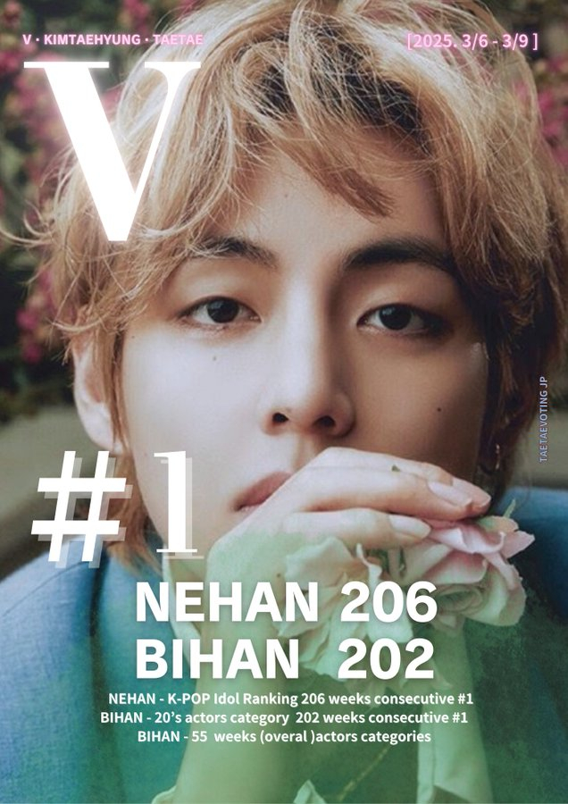 뷔는 2025년 3월 3일부터 3월 9일까지 일본 인기 아이돌 랭킹 사이트 '네한'(NEHAN)에서 진행한 남자 아이돌 랭킹 투표에서 206주 연속 1위 자리를 지켰다.
