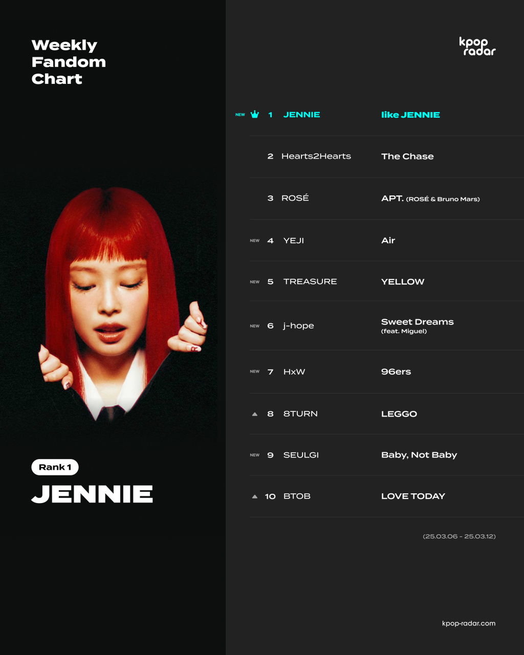 14일 '케이팝레이더'는 한 주간 가장 두드러진 성장을 보인 아티스트를 분석하는 증감률 기반 차트인 '위클리 팬덤 차트'를 발표했다. 해당 차트에서 제니가 신곡 '라이크 제니(like JENNIE)'로 1위에 등극했다.