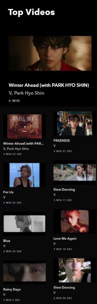 브라질 '타이달 톱 비디오'차트에는 1위에 'Winter Ahead'를 비롯해 '톱 10'에 9곡이 뷔의 솔로곡이 차지했다. 'Winter Ahead'에 이어 2위에 'Winter Ahead(YUNSEOKCHEOL TRIO Ver.)', 3위에는 'FRI(END)S', 4위 '포 어스', 5위 '슬로우 댄싱', 6위 '블루', 7위 '러브 미 어게인', 8위 '레이니 데이즈', 9위 '슬로우 댄싱(FRNK Remix)'이 뒤를 이었다.