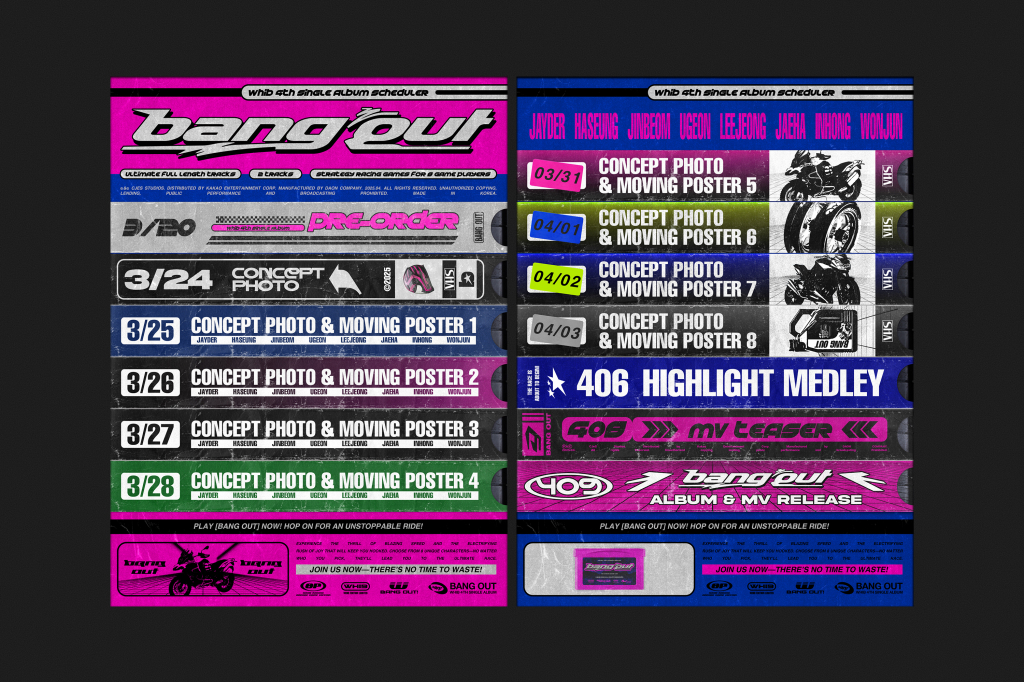앞서 콘셉트 스포일러 이미지를 공개하며 4월 9일 컴백 소식을 알린 휘브는 이전 앨범과는 사뭇 다른 분위기의 강렬한 '마젠타' 컬러로 가요계를 물들일 것을 암시했다. 또한 휘브는 네 번째 싱글 앨범 [BANG OUT]을 통해 8명의 멤버들이 한데 모여 게임 속 캐릭터로서의 변신을 예고한 상황. 휘브가 지닌 잠재력으로 이번 앨범을 통해 무한한 성장과 가능성을 어떻게 입증할지 궁금증과 기대감을 모은다.