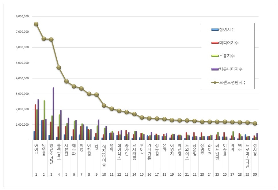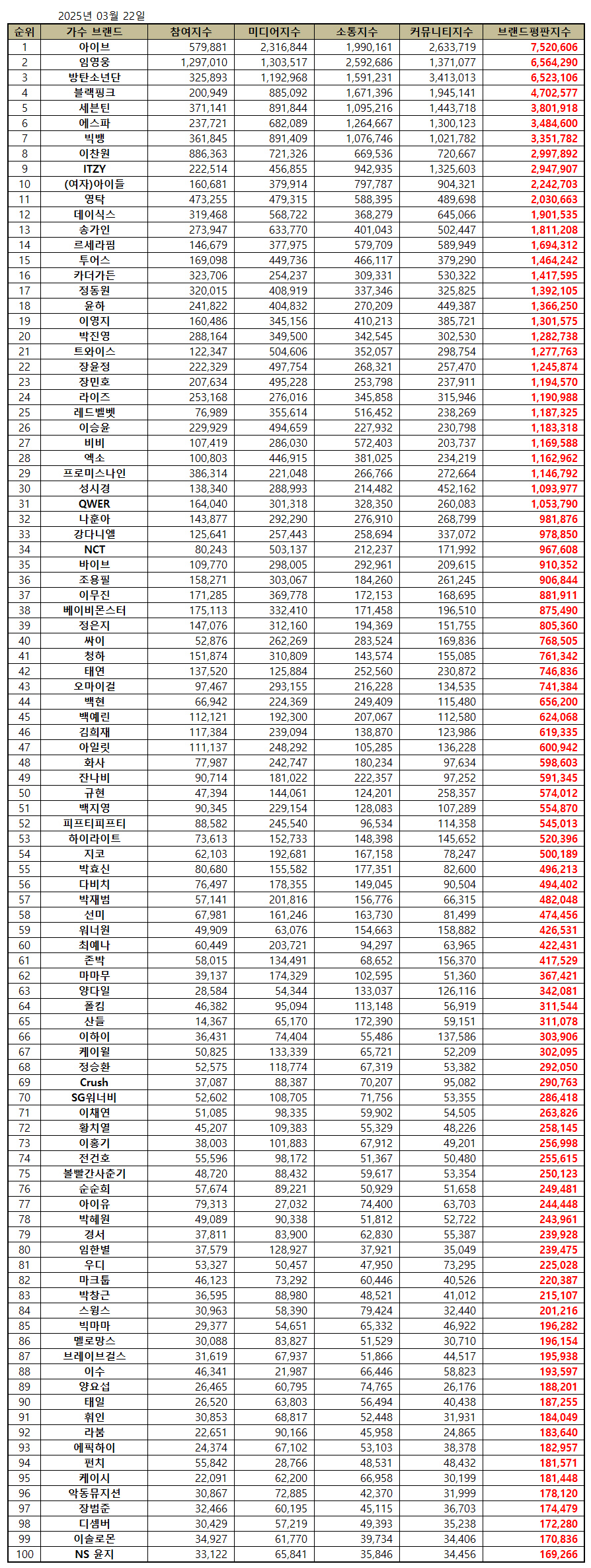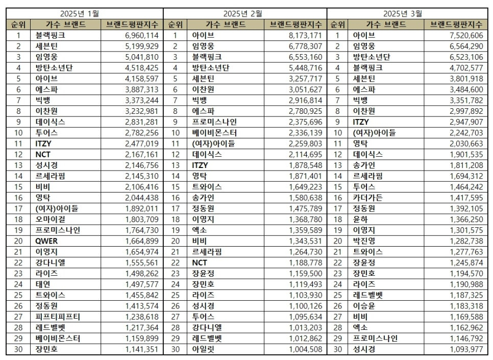 2025년 3월 가수 브랜드평판 30위 순위는 아이브, 임영웅, 방탄소년단, 블랙핑크, 세븐틴, 에스파, 빅뱅, 이찬원, ITZY, (여자)아이들, 영탁, 데이식스, 송가인, 르세라핌, 투어스, 카더가든, 정동원, 윤하, 이영지, 박진영, 트와이스, 장윤정, 장민호, 라이즈, 레드벨벳, 이승윤, 비비, 엑소, 프로미스나인, 성시경 순으로 분석됐다.