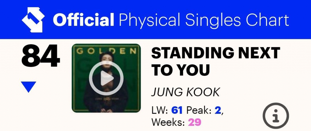 '영국 오피셜'(UK Official)이 발표한 최신 차트(3월21일~27일 자)에 따르면, 정국이 2023년 발매한 솔로곡 'Standing Next to You'는 '오피셜 피지컬 싱글' 차트에서 84위를 차지했다.