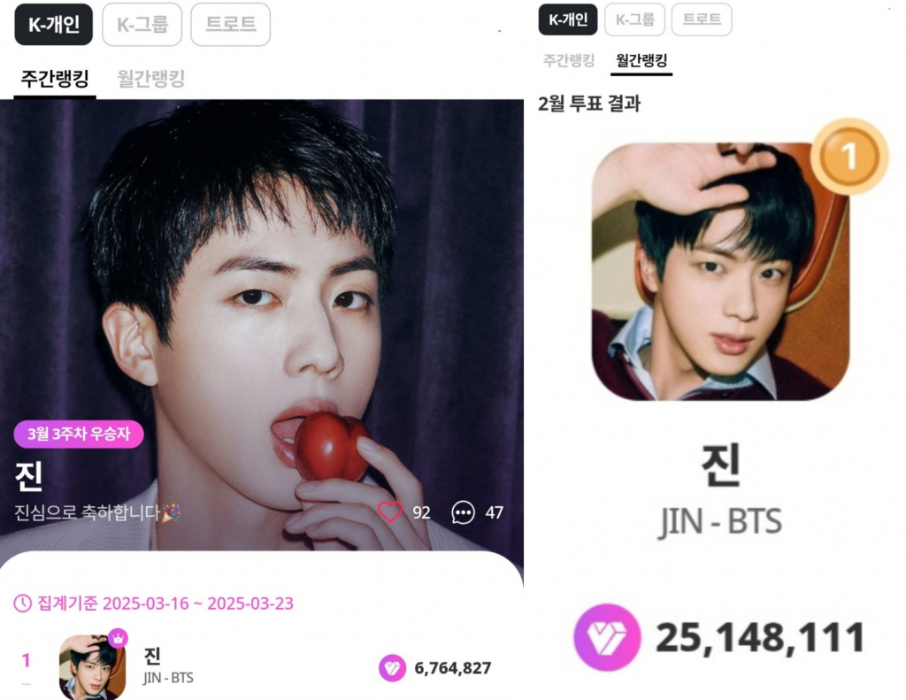 진은 지난 2월 총 누적 하트수 2514만 8111개를 얻어 1위를 차지, 'K-POP 개인부문 월간랭킹'에서 14개월 연속 1위를 기록했다.