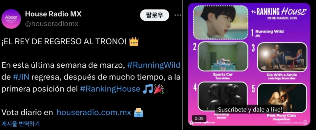 방탄소년단(BTS) 진이 멕시코 인기 라디오에서 주간랭킹 1위에 오르며 눈부신 인기를 입증했다.