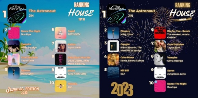 진의 '디 애스트로넛'은 하우스 라디오(House Radio)'에서 진행한 '2023 올해의 노래(RankigHouseYearEnd2023 TOP 30'에서도 1위를 차지했다. 앞서 23년 9월 '하우스 라디오'에서 진행한 '여름 추천곡'(Rankig House Summer Edition TOP30)에서도 1위로 선정되며 막강한 글로벌 인기를 과시했다.