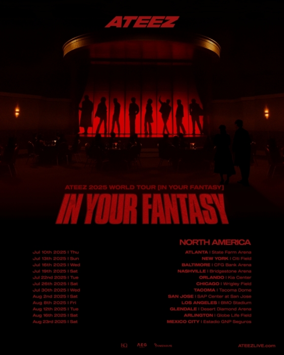 소속사 KQ엔터테인먼트는 3월 31일 오후 11시 공식 SNS를 통해 '에이티즈 2025 월드 투어 '인 유어 판타지'(ATEEZ 2025 WORLD TOUR 'IN YOUR FANTASY')' 한국, 북미, 일본 포스터를 공개하고 공연 개최 소식을 알렸다.