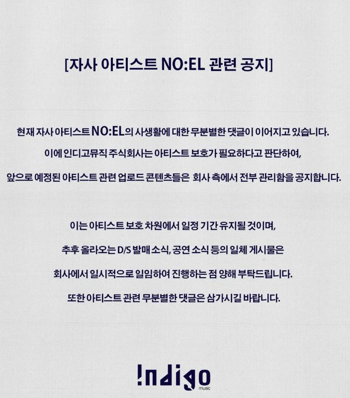 노엘 소속사 인디고뮤직은 1일 공식입장을 통해 "현재 노엘의 사생활에 대한 무분별한 댓글이 이어지고 있다. 이에 아티스트 보호가 필요하다고 판단, 앞으로 예정된 아티스트 관련 업로드 콘텐츠들은 회사 측에서 전부 관리한다"라고 전했다.