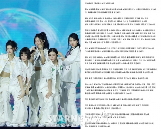 지난 4일 오후 뉴진스(민지, 하니, 다니엘, 해린, 혜인) 부모는 법무법인 세종을 통해 장문의 입장문을 발표했다.
