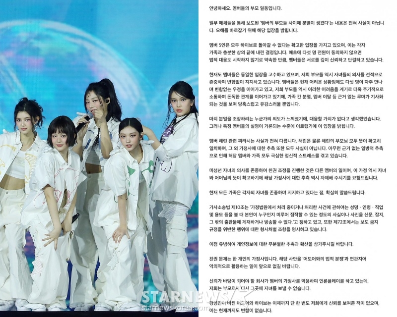 이날 뉴진스 부모 일동은 "일부 매체들을 통해 보도된 '멤버의 부모들 사이에 분열이 생겼다'는 내용은 전혀 사실이 아니다. 멤버 5인은 모두 하이브로 돌아갈 수 없다는 확고한 입장을 가지고 있으며, 이는 각자 가족과 충분한 상의 끝에 내린 결정이다. 애초에 다섯 명 전원이 동의하지 않으면 법적 대응도 시작하지 않기로 약속한 만큼, 멤버들은 서로를 깊이 신뢰하고 단결하고 있다"라고 밝혔다.