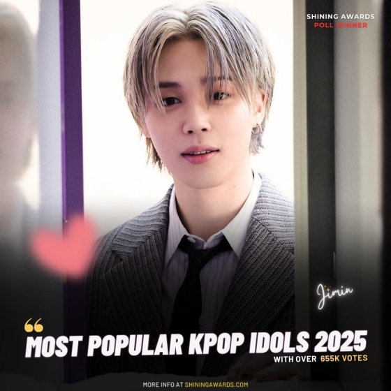 지민은 지난 3월 31일 마감된 글로벌 팬 투표 사이트 샤이닝 어워즈(Shining Awards)의 'Most Popular Kpop Idols 2025'에서 65만 5610표를 획득해 과반이 넘는 50.19%의 득표율로 1위에 올랐다.
