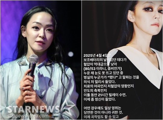 김윤아는 5일 자신의 개인 계정에 "2025년 4월 4일은 보조배터리의 날이었던 데다가 혈압이 역대급으로 낮아(80/50이라니, 좀비인가) 누운 채 눈도 못 뜨고 있던 중 병실의 누군가가 '됐다'고 말하는 것을 의식 저 멀리서 들었다"라며 "치료의 여파인지 저혈압의 영향인지 안도의 축복인지 이틀 동안 21시간 릴레이 수면. 이제 좀 정신이 들었다. 어떤 경우에도 일상 영위는 당연한 것이 아니라 귀한 것. 이제 곡 작업도 할 수 있고 공연 홍보도 할 수 있다"라고 담담히 밝혔다.