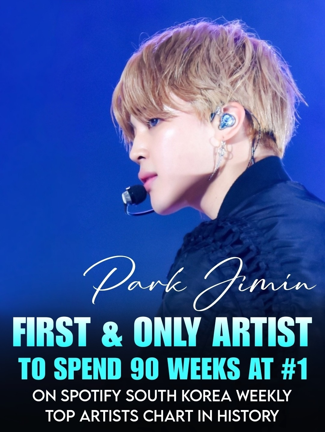 지난 4월 4일 발표된 세계 최대 음원 플랫폼 스포티파이의 차트 업데이트에 따르면, 지민은 스포티파이 한국 '위클리 톱 아티스트' 차트에서 1위를 유지하며 90번째 정상에 올랐다. 해당 차트 역사상 최초이자 유일한 90회 1위 대기록이다.