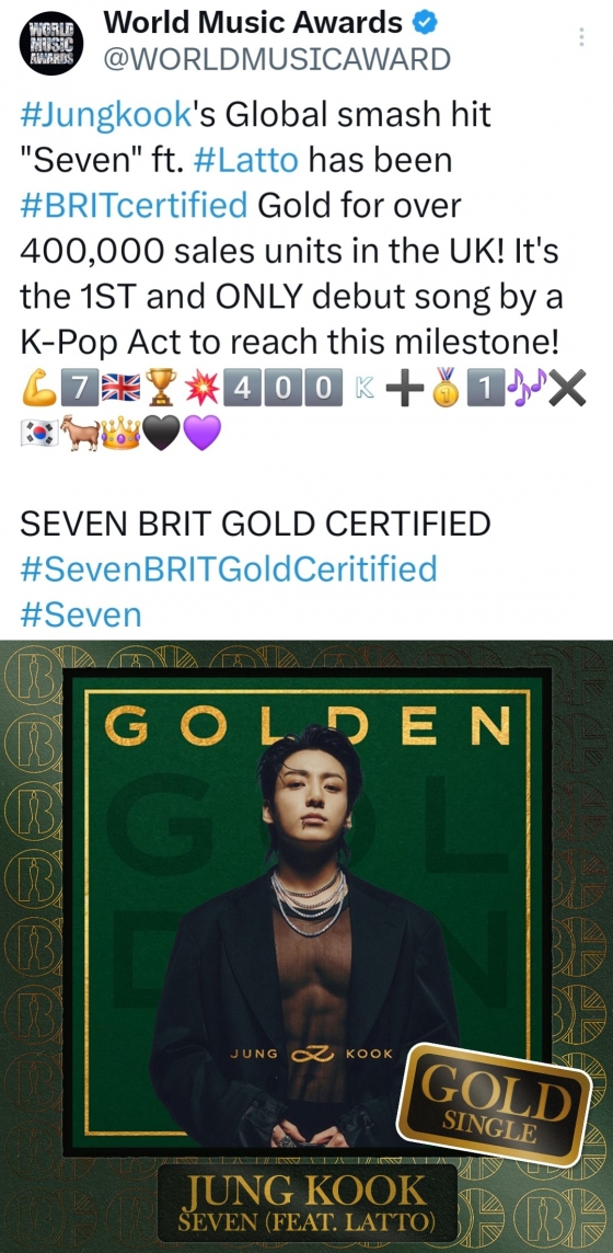 정국의 'Seven'은 K-팝 가수 데뷔곡으로는 최초이자 유일하게 '골드' 인증을 달성했다고 '월드뮤직어워드'(WMA)는 전했다.