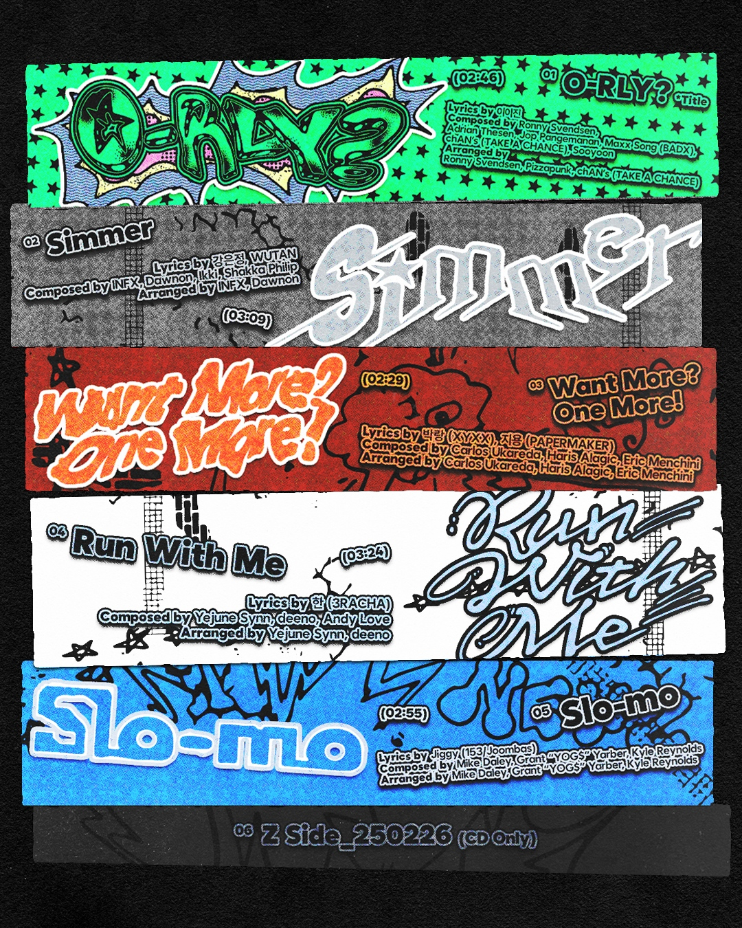 이에 따르면 신보에는 타이틀곡 'O-RLY?'를 필두로 'Simmer'(시머), 'Want More? One More!'(원트 모어? 원 모어!), 'Run With Me'(런 위드 미), 'Slo-mo'(슬로모)까지 총 다섯 곡과 피지컬 앨범에서만 들을 수 있는 'Z Side_250226 (CD Only)'(지 사이드)가 수록된다.