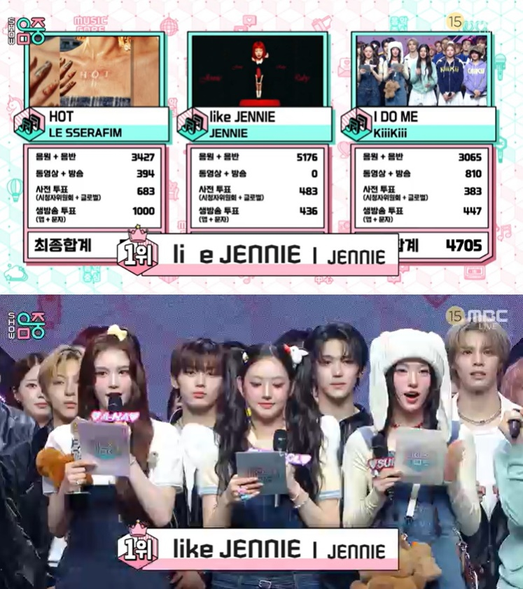 12일 오후 방송된 MBC 음악 프로그램 '쇼! 음악중심'(이하 '음중')에서는 제니가 1위를 차지했다. 이날 4월 2주차 1위 후보로 르세라핌 'HOT', 블랙핑크 제니 'like JENNIE', 키키 'I DO ME'가 올랐다.