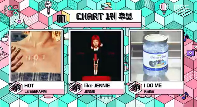 르세라핌은 'HOT', 제니는 'like JENNIE', 키키는 'I DO ME'로 '음중' 1위 후보에 이름을 올렸다.