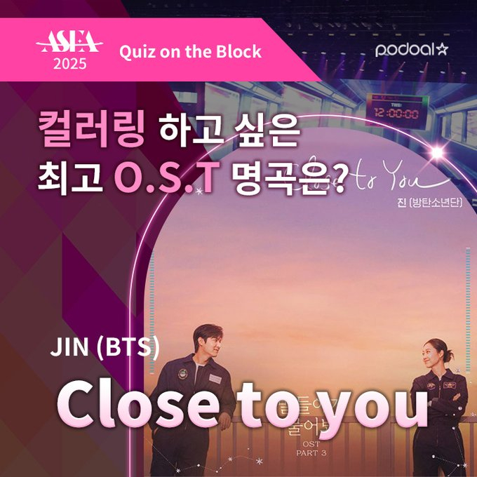 진의 'Close to You'(클로즈 투 유)는 ASEA 2025 공식 팬 투표 플랫폼 포도알(PODOAL)에서 지난 3월 26일부터 4월 2일까지 진행된 '컬러링으로 설정하고 싶은 최고의 O.S.T'에서 1위를 차지하며 최고의 글로벌 인기를 입증했다. 총 30곡이 후보로 오른 가운데 진의 'Close to You'는 총 3만 7370표를 획득, 압도적인 득표율을 보였다.
