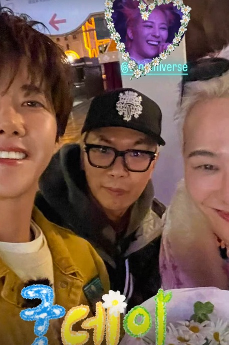 지드래곤은 16일 자신의 계정에 MBC '굿데이'를 함께 한 김태호 PD,황광희와 셀카를 남겼다.
