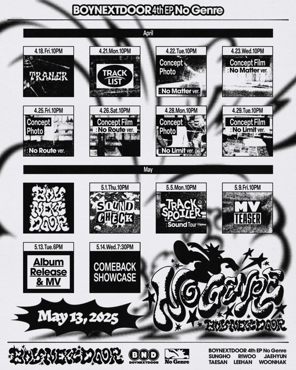 보이넥스트도어(성호, 리우, 명재현, 태산, 이한, 운학)는 16일 오후 10시 팀 공식 SNS에 미니 4집 'No Genre'의 스케줄러를 게재했다. 스케줄러는 다양한 정보를 힙하고 쿨한 흑백 디자인으로 표현해 눈길을 사로잡는다.