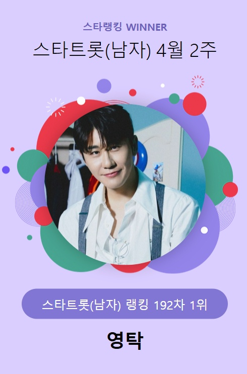 영탁은 지난 10일 오후 3시 1분부터 17일 오후 3시까지 진행된 4월 2주(192차) 스타랭킹 스타트롯 남자 랭킹 투표에서 12만 3933표를 얻고 1위에 또 한번 앉았다.