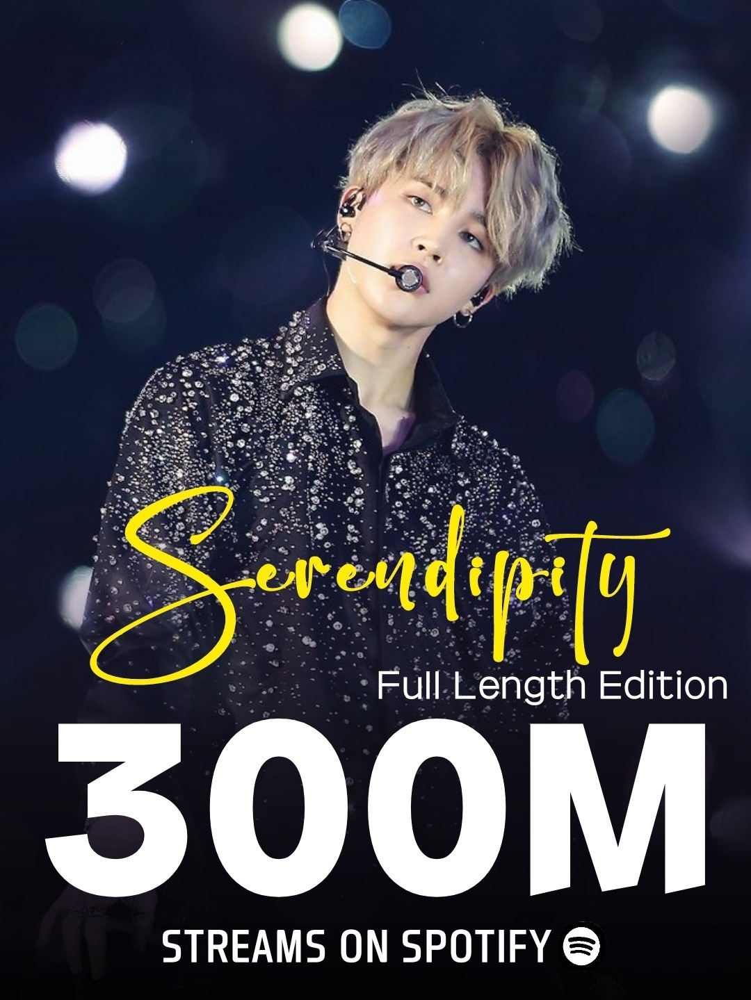 지민의 솔로곡 '세렌디피티' 풀 버전은 4월 19일 세계 최대 음원 플랫폼 스포티파이에서 3억 스트리밍을 돌파했다.