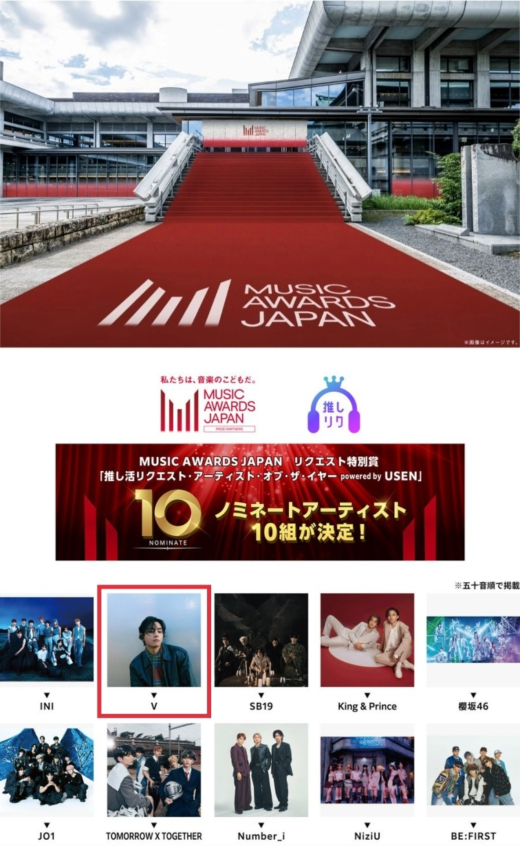 방탄소년단(BTS) 뷔가 '뮤직 어워즈 재팬'(MUSIC AWARDS JAPAN)에서 '최우수 아티스트' 부문에 K팝 솔로아티스트로 유일하게 노미네이트됐다.
