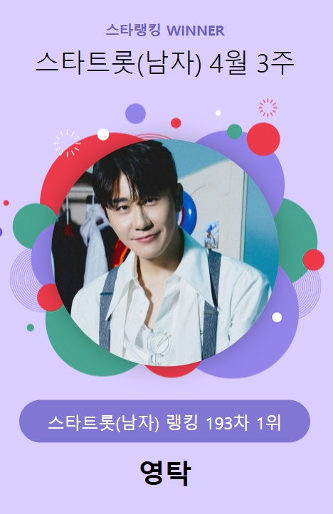 영탁은 지난 17일 오후 3시 1분부터 24일 오후 3시까지 진행된 4월 3주(193차) 스타랭킹 스타트롯 남자 랭킹 투표에서 16만 7283표를 얻고 1위를 지켰다.
