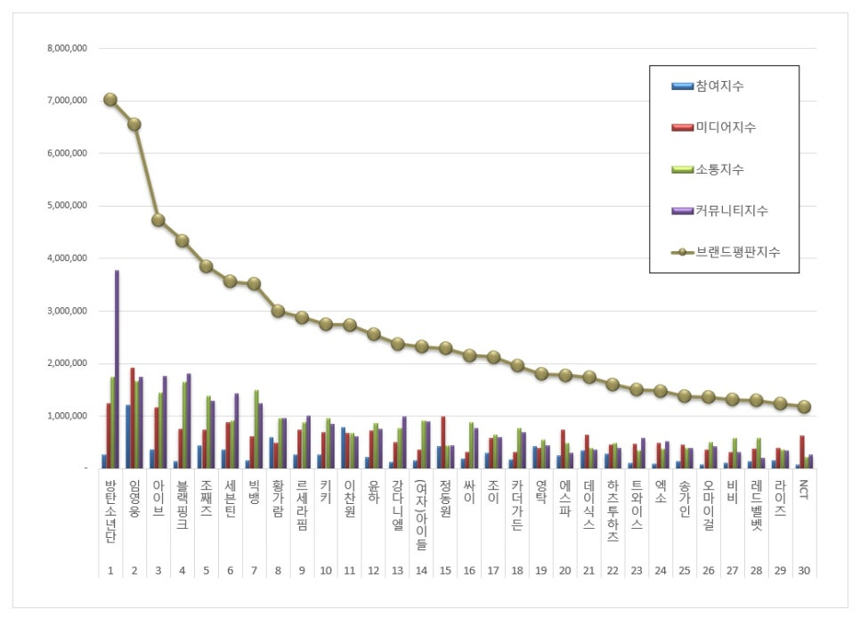 가수 브랜드평판 1위를 기록한 방탄소년단 ( RM, 진, 슈가, 제이홉, 지민, 뷔, 정국 ) 브랜드는 참여지수 261,507 미디어지수 1,233,812 소통지수 1,750,670 커뮤니티지수 3,776,830이 되면서 브랜드평판지수 7,022,818로 분석됐다. 지난 3월 브랜드평판지수 6,523,106과 비교해보면 7.66% 상승했다.