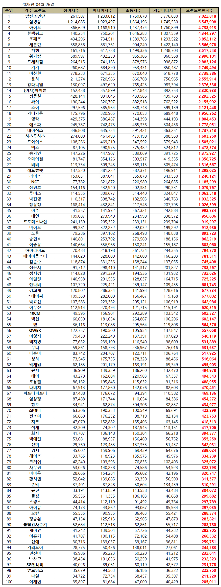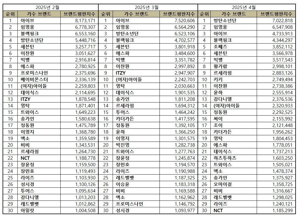 2025년 4월 가수 브랜드평판 30위 순위는 방탄소년단, 임영웅, 아이브, 블랙핑크, 세븐틴, 빅뱅, 르세라핌, 키키, 이찬원, 강다니엘, 윤하, (여자)아이들, 정동원, 황가람, 싸이, 조이, 카더가든, 영탁, 에스파, 데이식스, 하츠투하츠, 트와이스, 엑소, 조째즈, 송가인, 오마이걸, 비비, 레드벨벳, 라이즈, NCT 순으로 분석됐다.