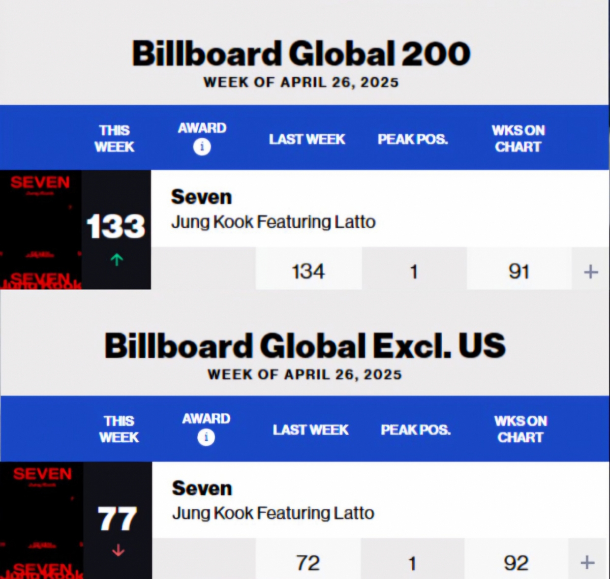 미국 음악 전문 매체 빌보드(Billboard)가 발표한 최신 차트(4월 26일 자)에 따르면, 2023년 7월에 발매한 정국의 첫 솔로 데뷔곡 'Seven'이 '글로벌 200'에서 133위를 차지했다.