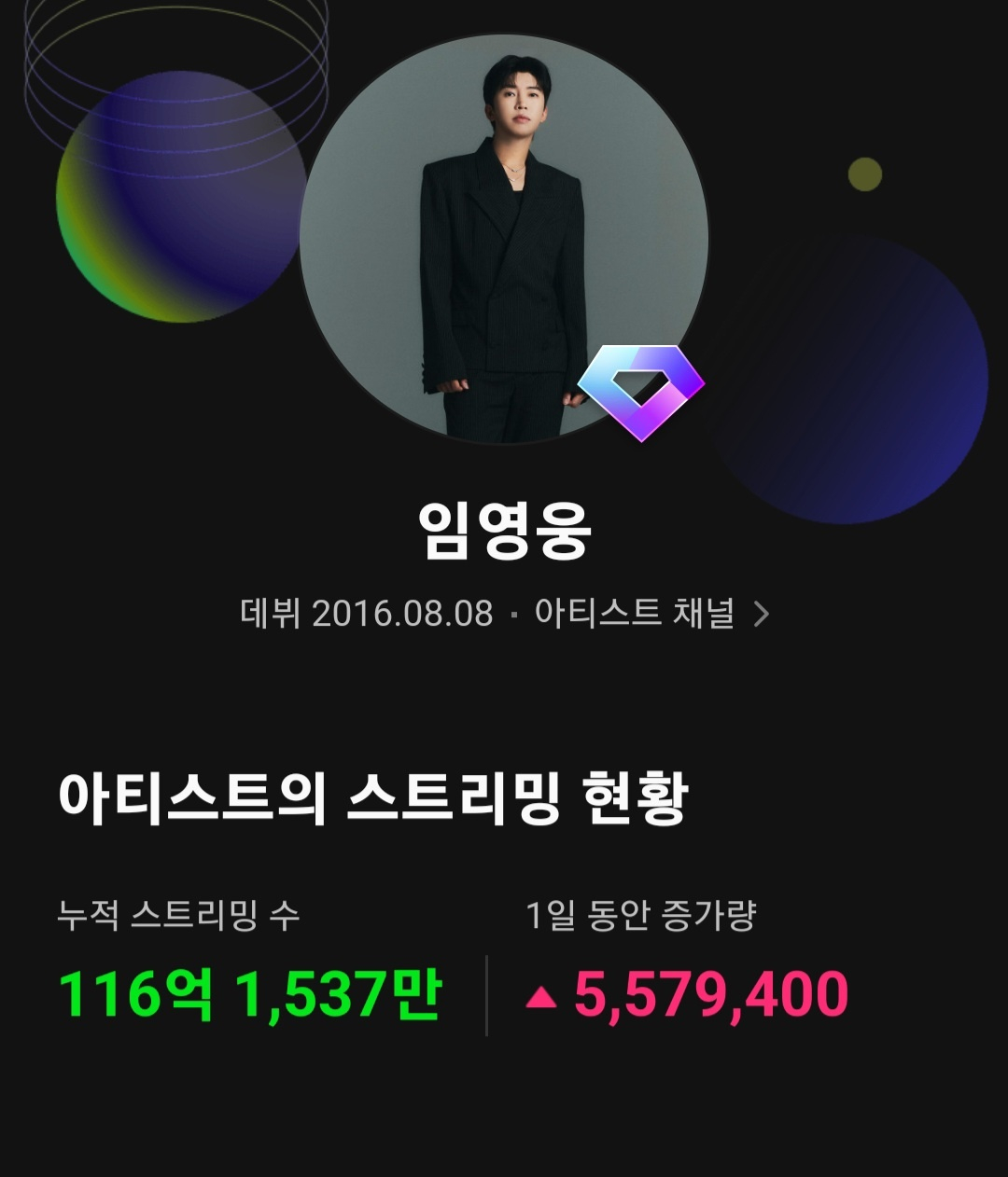 임영웅은 4월 27일 국내 주요 음원 플랫폼 멜론(Melon)에서 누적 스트리밍 116억 회를 넘어섰다. 이날 기준 임영웅의 멜론 누적 스트리밍 수는 116억 1537만 회였다.