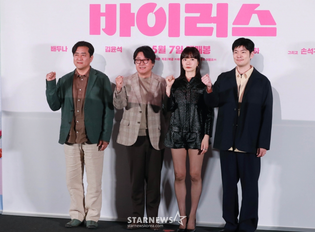 강이관 감독, 배우 김윤석, 배두나, 장기하가 28일 오후 서울 CGV 용산아이파크몰에서 진행된 영화 '바이러스'(감독 강이관) 언론배급시사회 및 기자간담회에 참석해 포즈를 취하고 있다.