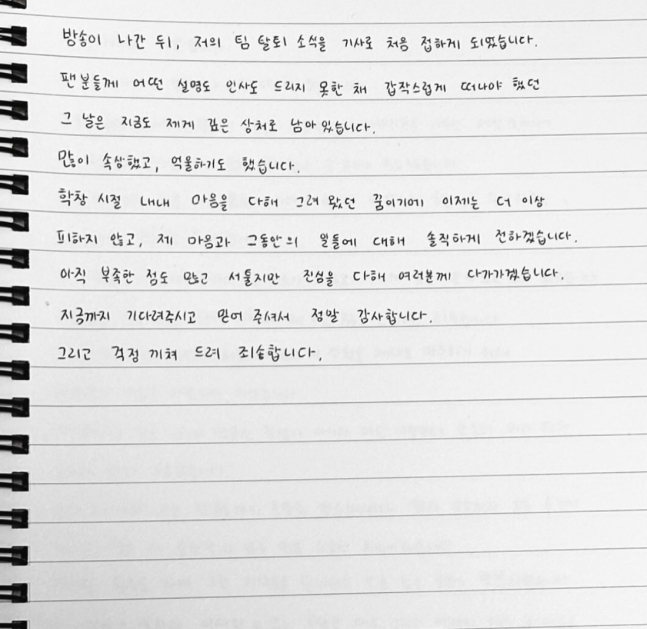 방송이 나간 뒤, 저의 팀 탈퇴 소식을 기사로 처음 접하게 되었습니다. 팬분들께 어떤 설명도 인사도 드리지 못한 채 갑작스럽게 떠나야 했던 그 날은 지금도 제게 깊은 상처로 남아 있습니다.