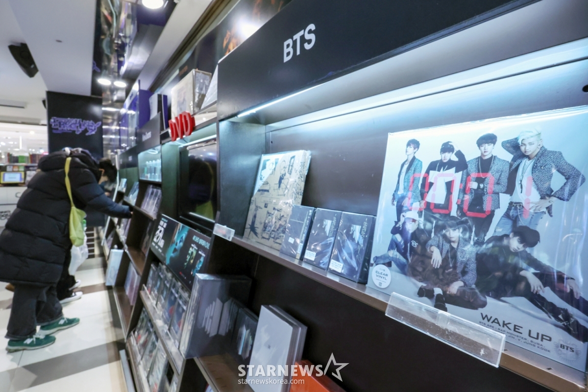 (서울=뉴스1) 민경석 기자 = 2023년 '1억 장'을 넘긴 K팝 음반 판매량이 지난해 상승세가 꺾여 9300여만 장을 기록한 것으로 조사됐다. K팝 음반 판매량이 하락세로 돌아선 건 10년 만에 처음이다. 올해 그룹 방탄소년단(BTS)과 블랙핑크가 완전체 컴백이 예고된 만큼, K팝 시장이 다시 한번 돌파구를 찾을 수 있을지 시장의 관심이 모이고 있다. 11일 서울의 한 음반 매장에 K팝 음반이 진열돼 있다. 2025.2.11/뉴스1 Copyright © 뉴스1. All rights reserved. 무단 전재 및 재배포, AI학습 이용 금지. /사진=(서울=뉴스1) 민경석 기자