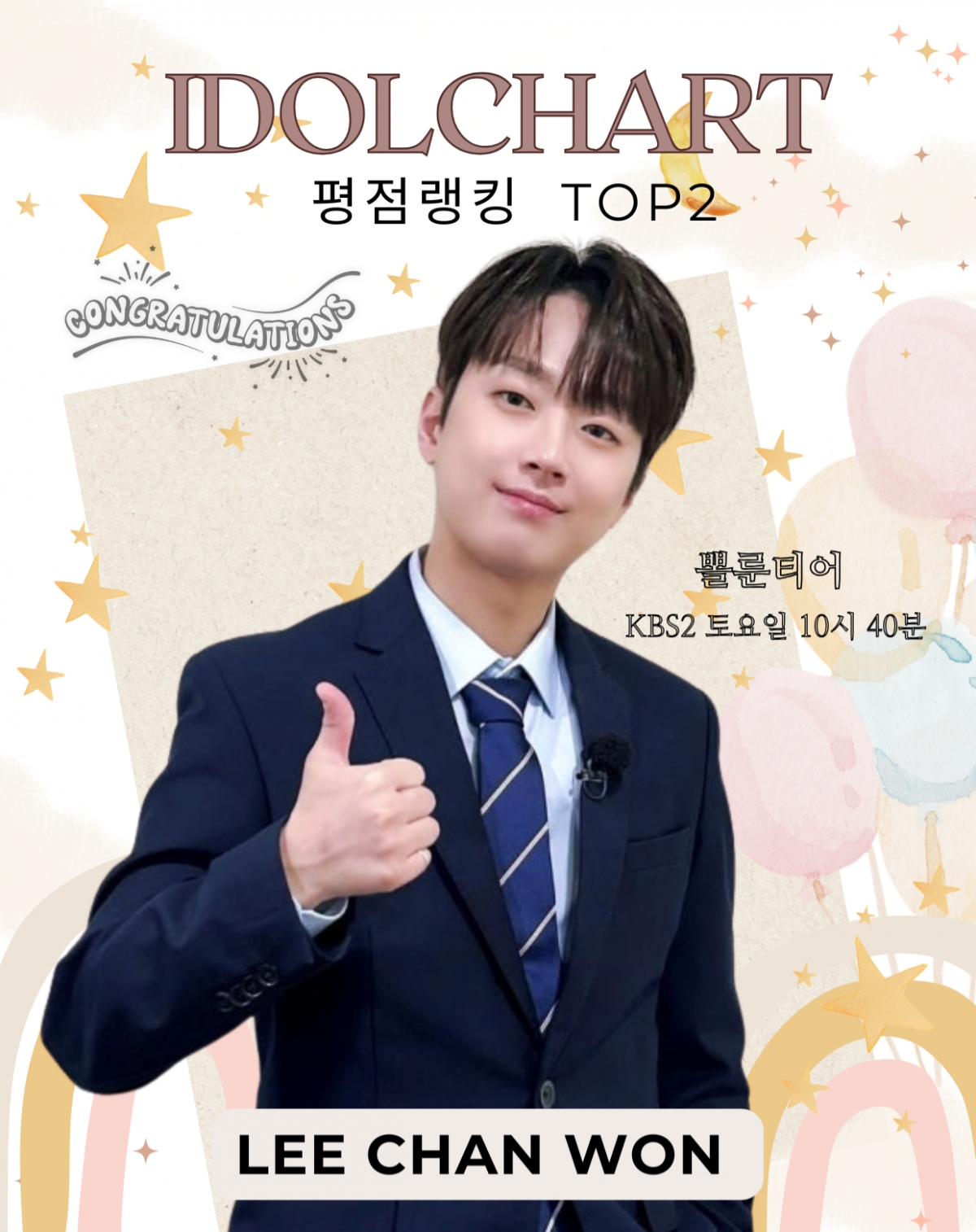 이찬원은 2025년 4월 4주 차 아이돌차트 평점랭킹에서 10만 190표를 획득, 전체 2위를 차지했다.