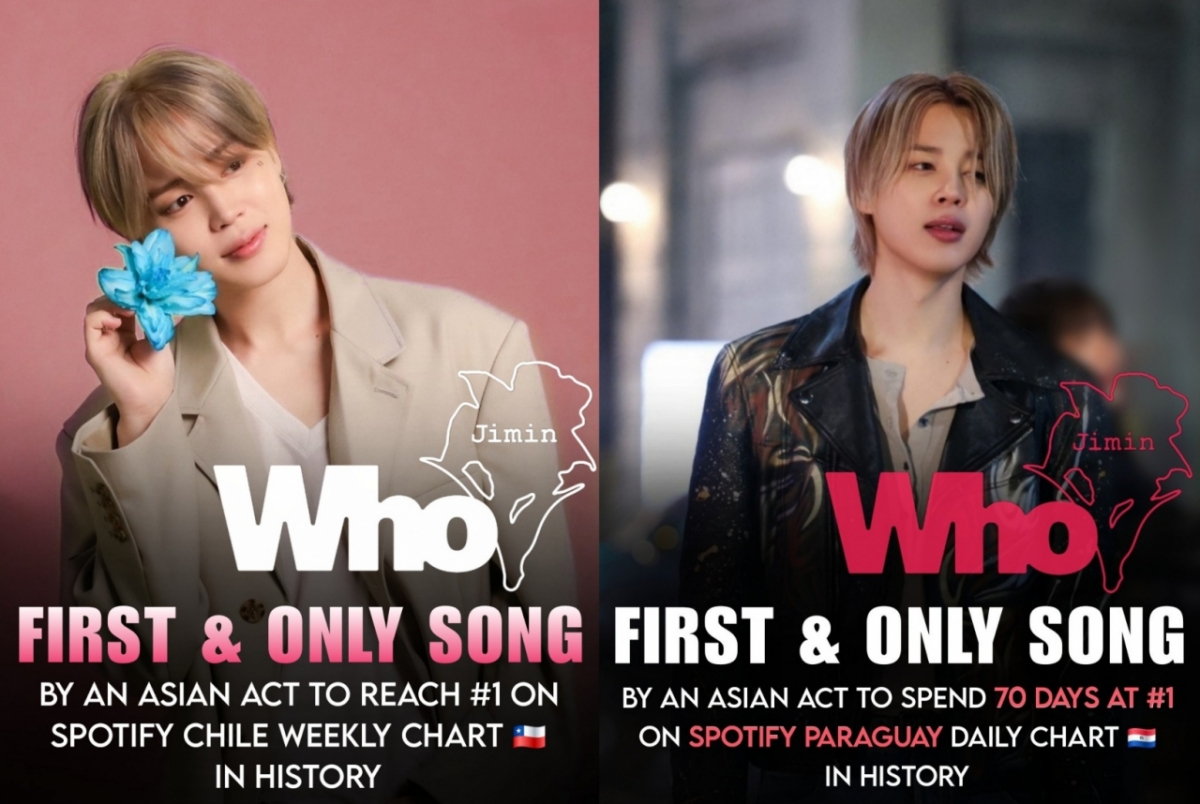 5월 2일 세계 최대 음원 플랫폼 스포티파이의 업데이트에 따르면, 지민의 솔로 2집 'MUSE'(뮤즈) 타이틀곡 'Who'(후)는 스포티파이 칠레 위클리 톱 송 차트에서 1위에 올랐다.