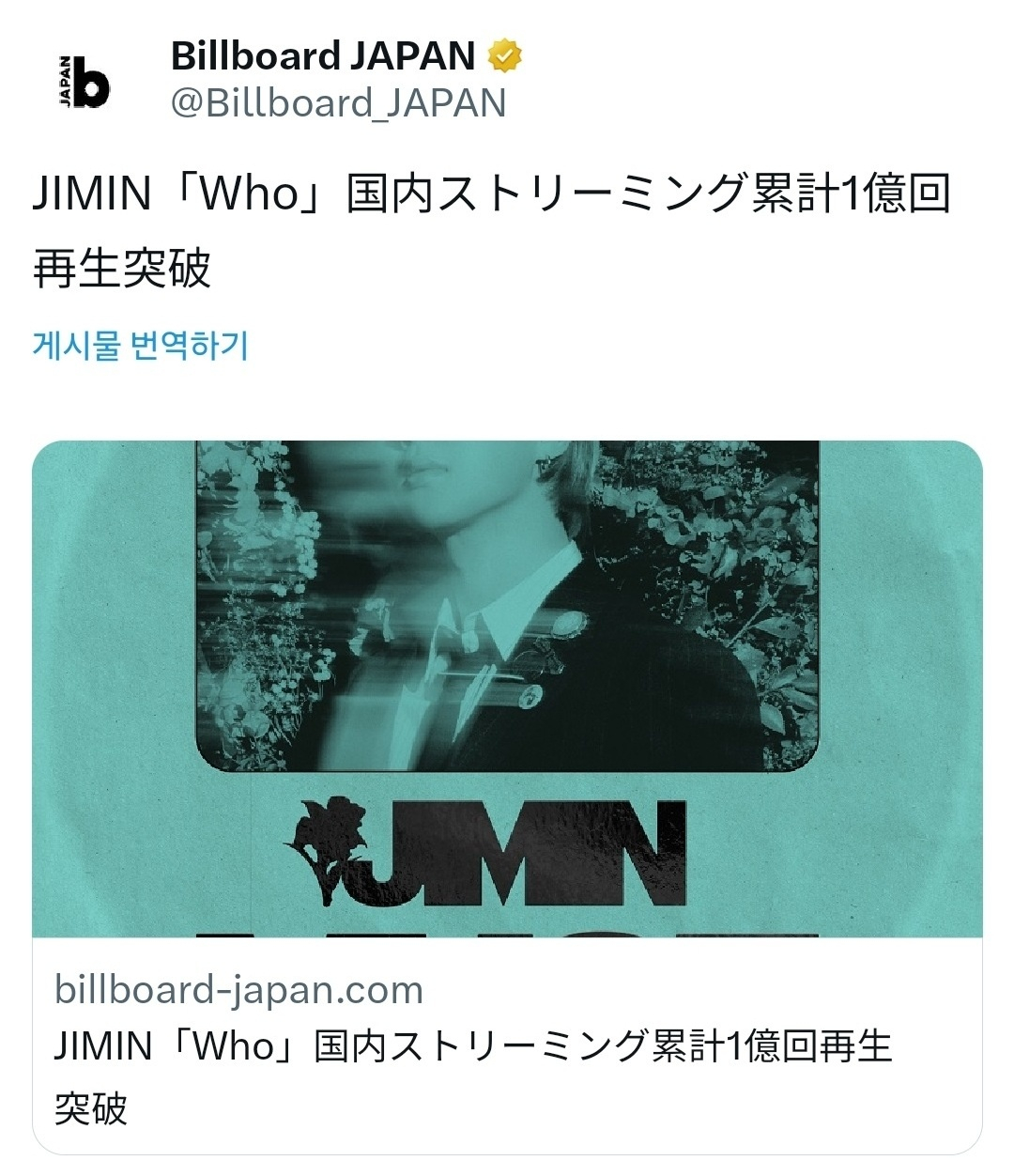 빌보드 재팬 뉴스는 4월 30일 지민의 '후'가 일본내 스트리밍 누적 1억회 재생 돌파'라는 제목의 기사에서 지민 2집 'MUSE'(뮤즈) 타이틀곡 '후'의 현지 흥행을 전했다.