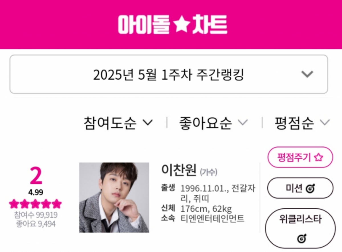 이찬원은 2025년 5월 1주 차 아이돌차트 평점랭킹에서 9만 9919표를 획득, 전체 2위를 차지했다.