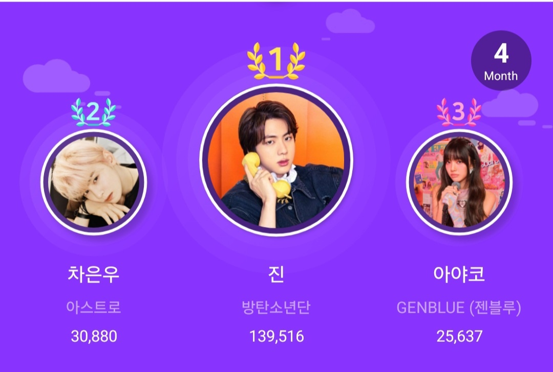 진은 지난 4월 1일부터 15일까지 글로벌 팬덤 플랫폼 스타 플래닛(STAR PLANET)에서 진행한 4월 아이돌 랭킹에서 13만 9516표를 얻으며 압도적인 득표수로 1위에 올랐다.