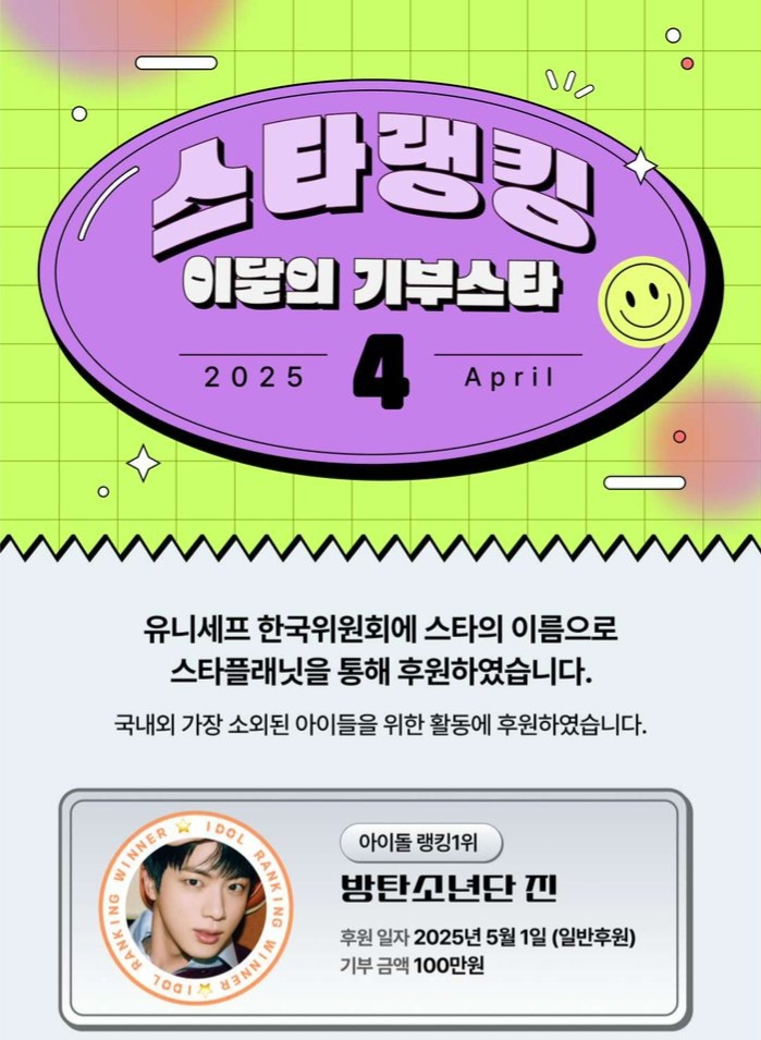 스타 플래닛은 4월 아이돌 랭킹 1위를 차지한 진의 이름으로 5월 1일 유니세프 한국위원회에 100만 원의 기부금을 전달했다고 밝혔다.