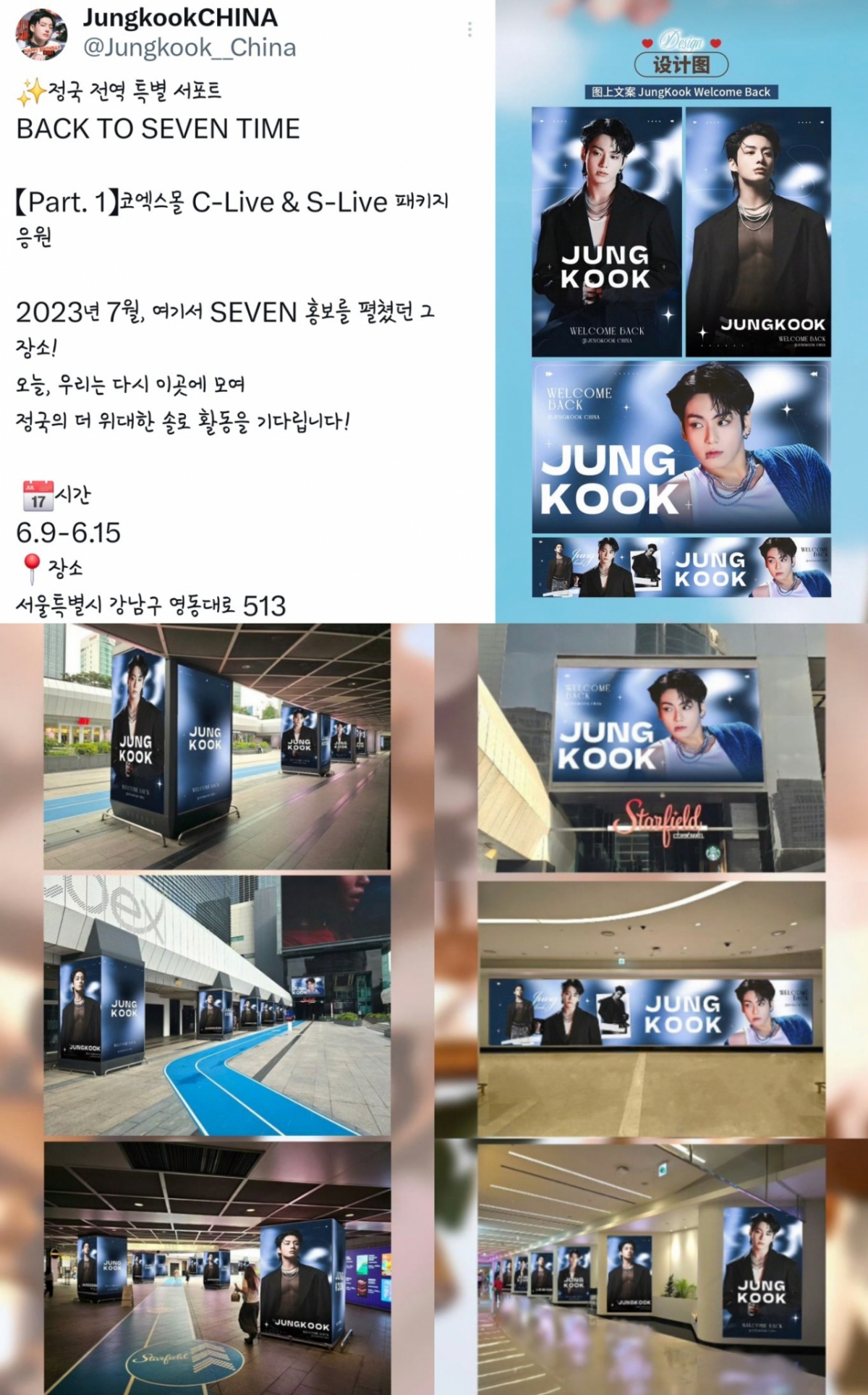 '정국 차이나'는 이번 서포트를 'BACK TO SEVEN TIME'이라는 콘셉트로 정국의 더 위대한 솔로 활동을 기다린다는 깊은 의미를 담아 2023년 7월, 정국의 첫 솔로 데뷔곡 'Seven'(세븐) 발매 홍보를 펼쳤던 S-LIVE, C-Live에서 또 다시 전역 특별 광고를 진행하게 됐다고 전했다.