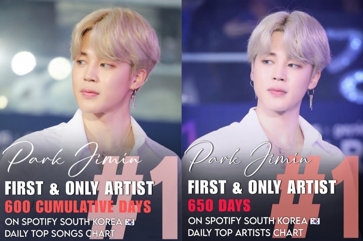 스포티파이 한국 '데일리 톱 송' 차트에서 가장 많은 1위를 달성한 지민의 기록(600회)은 두번째로 많은 1위를 달성한 방탄소년단(총 152회) 기록의 4배에 가까운 수치로써 지민의 독보적인 차트 장악력을 보여준다.