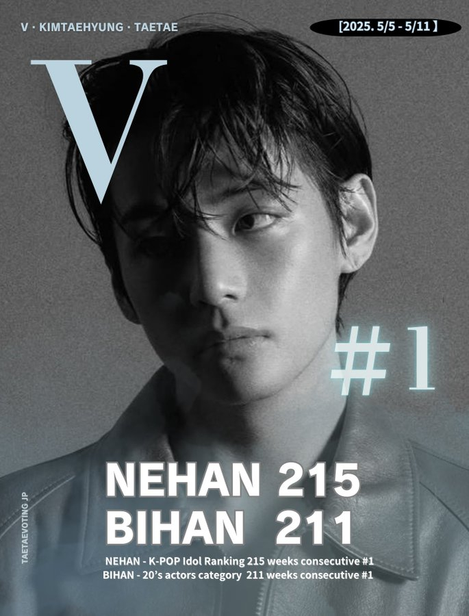 뷔는 2025년 5월 5일부터 5월 11일까지 일본 인기 아이돌 랭킹 사이트 '네한'(NEHAN)에서 실시한 남자 아이돌 랭킹 투표에서 215주 연속 1위 기록을 경신했다. 같은 기간 한국 배우 인기 랭킹 사이트 '비한'(BIHAN)의 '20대 한국 배우' 부문에서는 211주 연속 1위를 기록하며 연기자로서의 존재감을 입증했다.