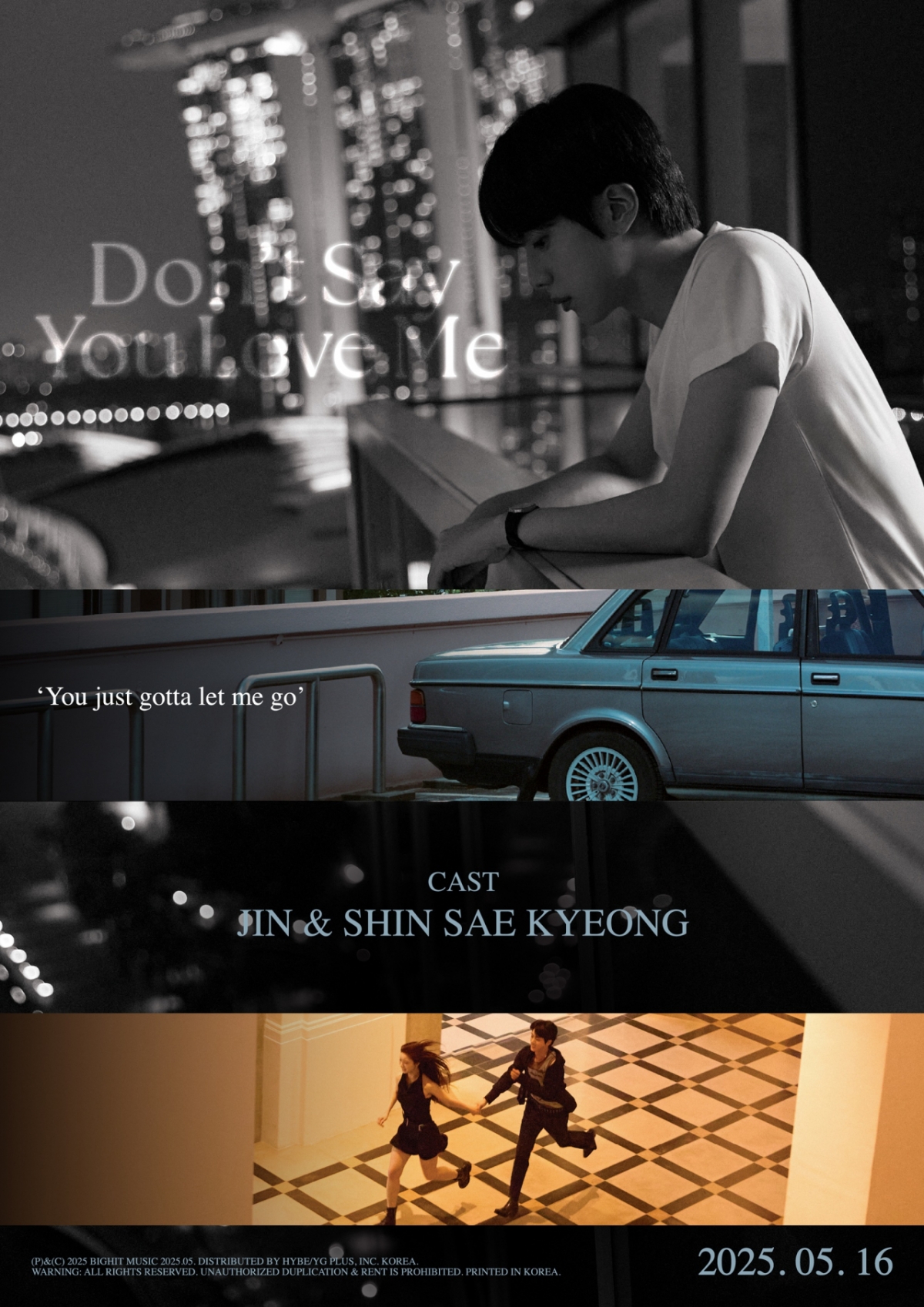 드라마타이즈 형식으로 제작된 'Don't Say You Love Me' 뮤직비디오는 진과 더불어 배우 신세경이 출연한다. 오늘(15일) 추가 공개된 뮤직비디오 포스터 속 연인으로 분한 두 사람의 다채로운 장면들이 아련하고 아름답다. 앞선 티저 영상은 이들이 마주하는 단 한 장면만으로 진한 여운을 남긴 바 있다.