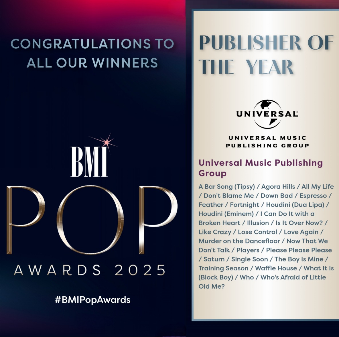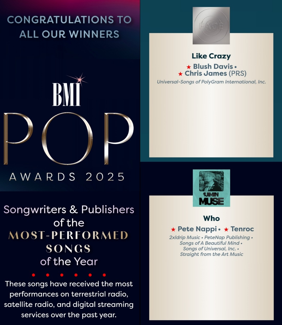 지민은 최근 미국 저작권 단체 BMI(Broadcast Music, inc.)가 미국 로스앤젤레스 비버리 윌셔(Beverly Wilshire)에서 개최한 '2025년 BMI 팝 어워드'(2025 BMI Pop Awards)에서 '올 한해 가장 많이 공연된 노래'(Most-Performed Songs of the Year) 부문에 두 곡이 선정되는 영예를 안았다.