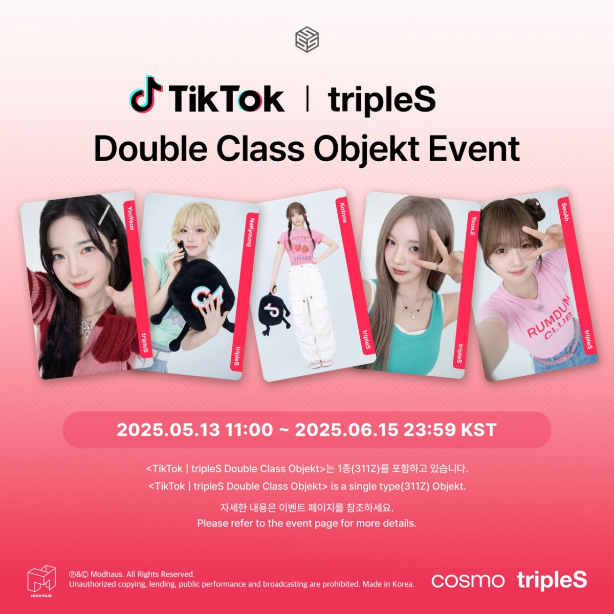 모드하우스에 따르면 트리플에스는 6월 15일까지 'TikTok x tripleS Double Class Objekt' 캠페인을 진행한다. '깨어(Are You Alive)' 발매와 발을 맞춰, 틱톡 이용자는 다양한 미션을 통해 멤버들의 틱톡 한정판 오브젝트를 수집할 수 있다.