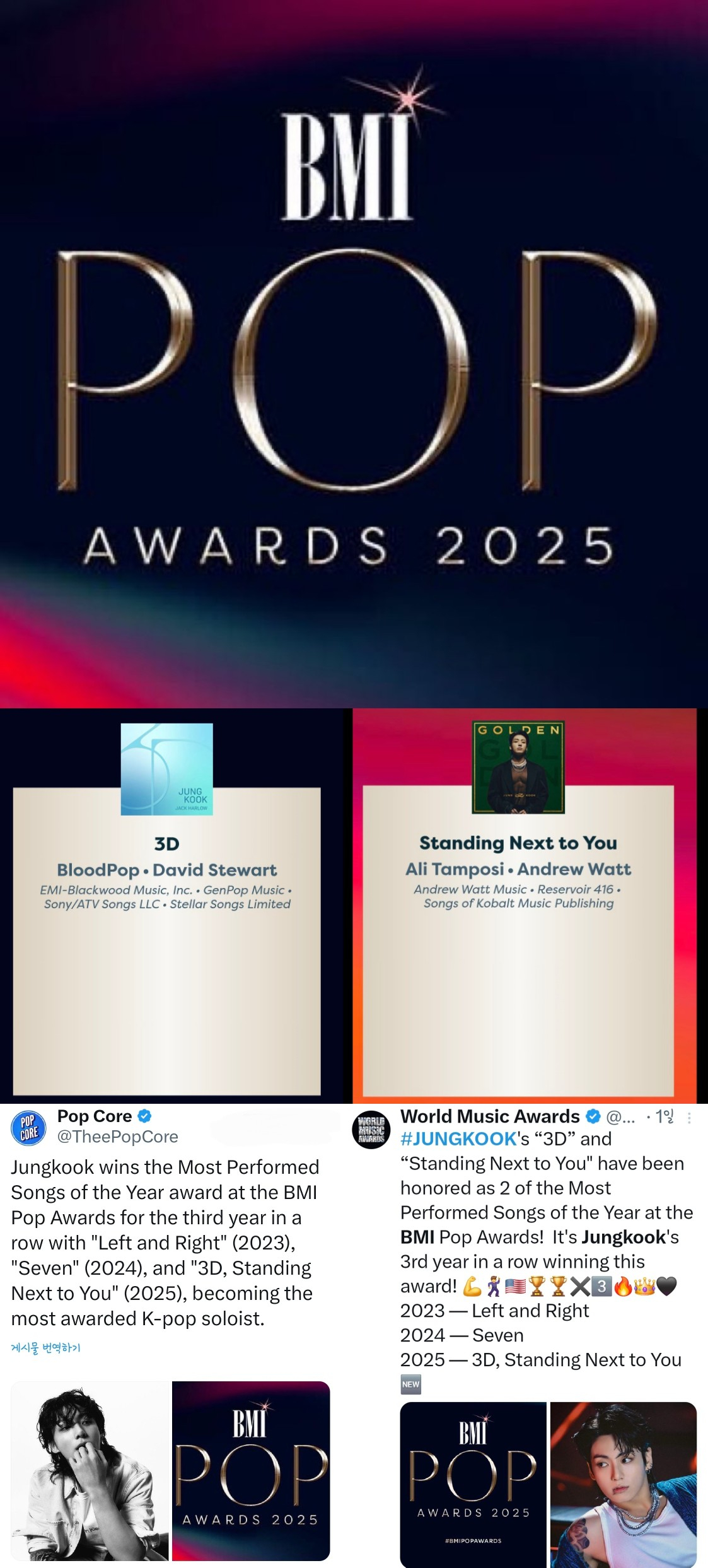 최근 '2025 BMI 팝 어워드'(2025 BMI Pop Awards)가 발표한 올해의 수상작 명단에 따르면, 정국의 '3D'와 'Standing Next to You'(스탠딩 넥스트 투 유)는 'Most Performed Songs of the Year'(올해 가장 많이 재생된 노래)로 뽑혔다.