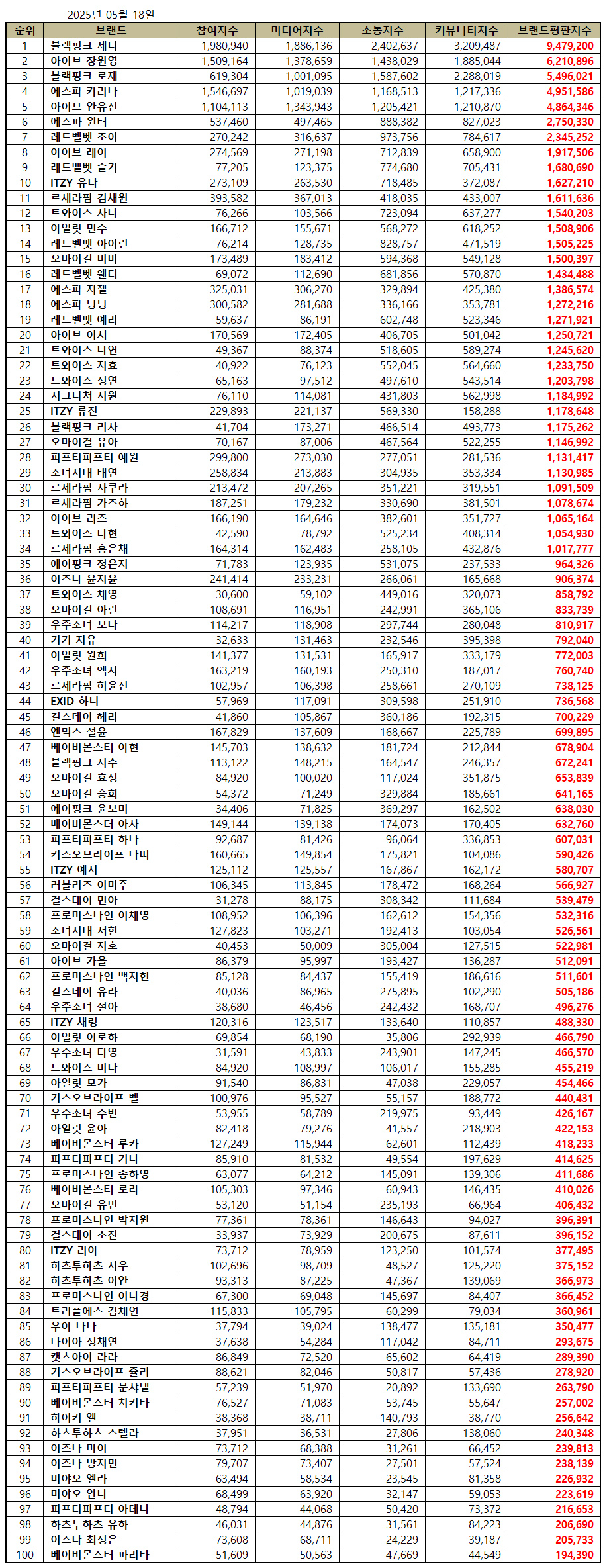 2025년 5월 걸그룹 개인 브랜드평판 100위 브랜드는 블랙핑크 제니, 아이브 장원영, 블랙핑크 로제, 에스파 카리나, 아이브 안유진, 에스파 윈터, 레드벨벳 조이, 아이브 레이, 레드벨벳 슬기, ITZY 유나, 르세라핌 김채원, 트와이스 사나, 아일릿 민주, 레드벨벳 아이린, 오마이걸 미미, 레드벨벳 웬디, 에스파 지젤, 에스파 닝닝, 레드벨벳 예리, 아이브 이서, 트와이스 나연, 트와이스 지효, 트와이스 정연, 시그니처 지원, ITZY 류진, 블랙핑크 리사, 오마이걸 유아, 피프티피프티 예원, 소녀시대 태연, 르세라핌 사쿠라, 르세라핌 카즈하, 아이브 리즈, 트와이스 다현, 르세라핌 홍은채, 에이핑크 정은지, 이즈나 윤지윤, 트와이스 채영, 오마이걸 아린, 우주소녀 보나, 키키 지유, 아일릿 원희, 우주소녀 엑시, 르세라핌 허윤진, EXID 하니, 걸스데이 혜리, 엔믹스 설윤, 베이비몬스터 아현, 블랙핑크 지수, 오마이걸 효정, 오마이걸 승희, 에이핑크 윤보미, 베이비몬스터 아사, 피프티피프티 하나, 키스오브라이프 나띠 , ITZY 예지, 러블리즈 이미주, 걸스데이 민아, 프로미스나인 이채영, 소녀시대 서현, 오마이걸 지호, 아이브 가을, 프로미스나인 백지헌, 걸스데이 유라, 우주소녀 설아, ITZY 채령, 아일릿 이로하, 우주소녀 다영, 트와이스 미나, 아일릿 모카, 키스오브라이프 벨 , 우주소녀 수빈, 아일릿 윤아, 베이비몬스터 루카, 피프티피프티 키나, 프로미스나인 송하영, 베이비몬스터 로라, 오마이걸 유빈, 프로미스나인 박지원, 걸스데이 소진, ITZY 리아, 하츠투하츠 지우, 하츠투하츠 이안, 프로미스나인 이나경, 트리플에스 김채연, 우아 나나, 다이아 정채연, 캣츠아이 라라, 키스오브라이프 쥴리 , 피프티피프티 문샤넬, 베이비몬스터 치키타, 하이키 옐, 하츠투하츠 스텔라, 이즈나 마이, 이즈나 방지민, 미야오 엘라, 미야오 안나, 피프티피프티 아테나, 하츠투하츠 유하, 이즈나 최정은, 베이비몬스터 파리타 순으로 분석됐다.