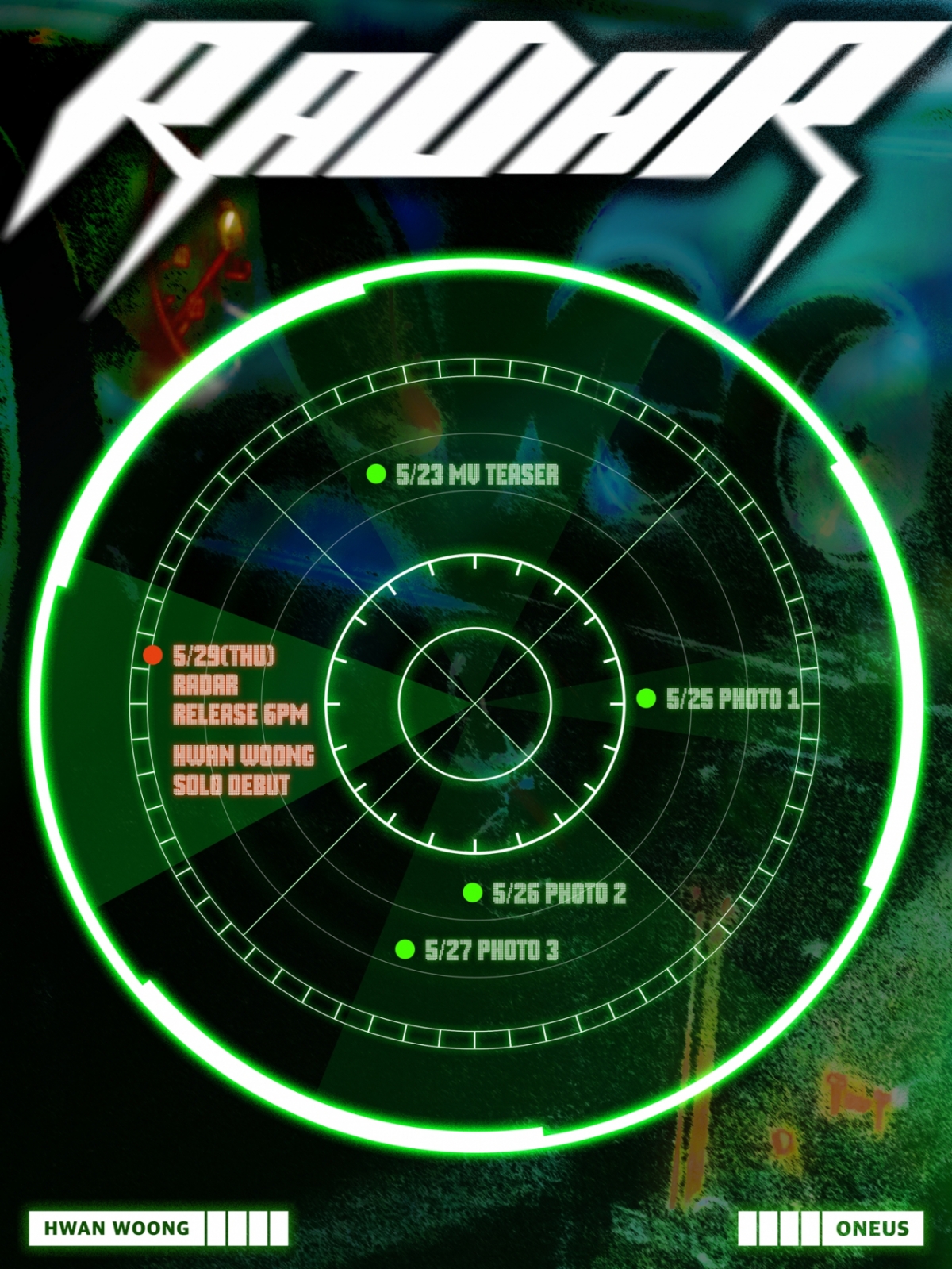 솔로 싱글 발매 소식과 함께 환웅은 오늘(21일) 0시 원어스 공식 SNS를 통해 'RADAR'의 스케줄 플랜을 업로드했다. 원형 레이더를 본떠 제작된 점이 인상적이다. 스케줄 플랜에 따르면, 환웅은 오는 23일 뮤직비디오 티저를 시작으로 세 차례에 걸쳐 콘셉트 포토를 차례로 공개할 예정이다.